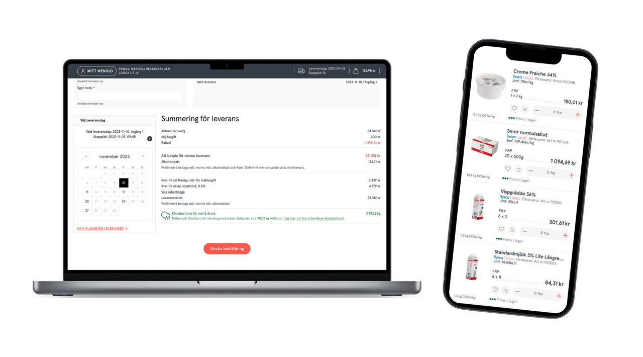 I vår e-handel kan du se och jämföra klimatavtrycket mellan alla livsmedel i sortimentet. Bredvid varje produkt får du upp en siffra med koldioxidekvivalenten (CO2e/kg), det vill säga den motsvarande mängd koldiodixutsläpp som varje kilo av din vara påverkar klimatet med. Dessa siffror redovisas för all mat och dryck i vårt sortiment, så att du enkelt kan jämföra. Kanske vill du byta någon av dina varor mot en motsvarande med lägre utsläppsmängd? I din varukorg ser du också den totala utsläppsmängden för dina inköp.