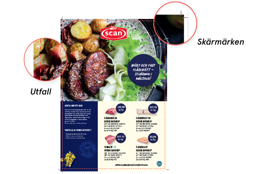 Ditt designdokument bör alltid vara med skärmärken och utfall om minst 3 mm. Detta för att undvika att du får en vit ram runt din annons (utfall) och att vi vet var vi ska beskära din annons (skärmärken). Detta gör du när filen ska exporteras till pdf.