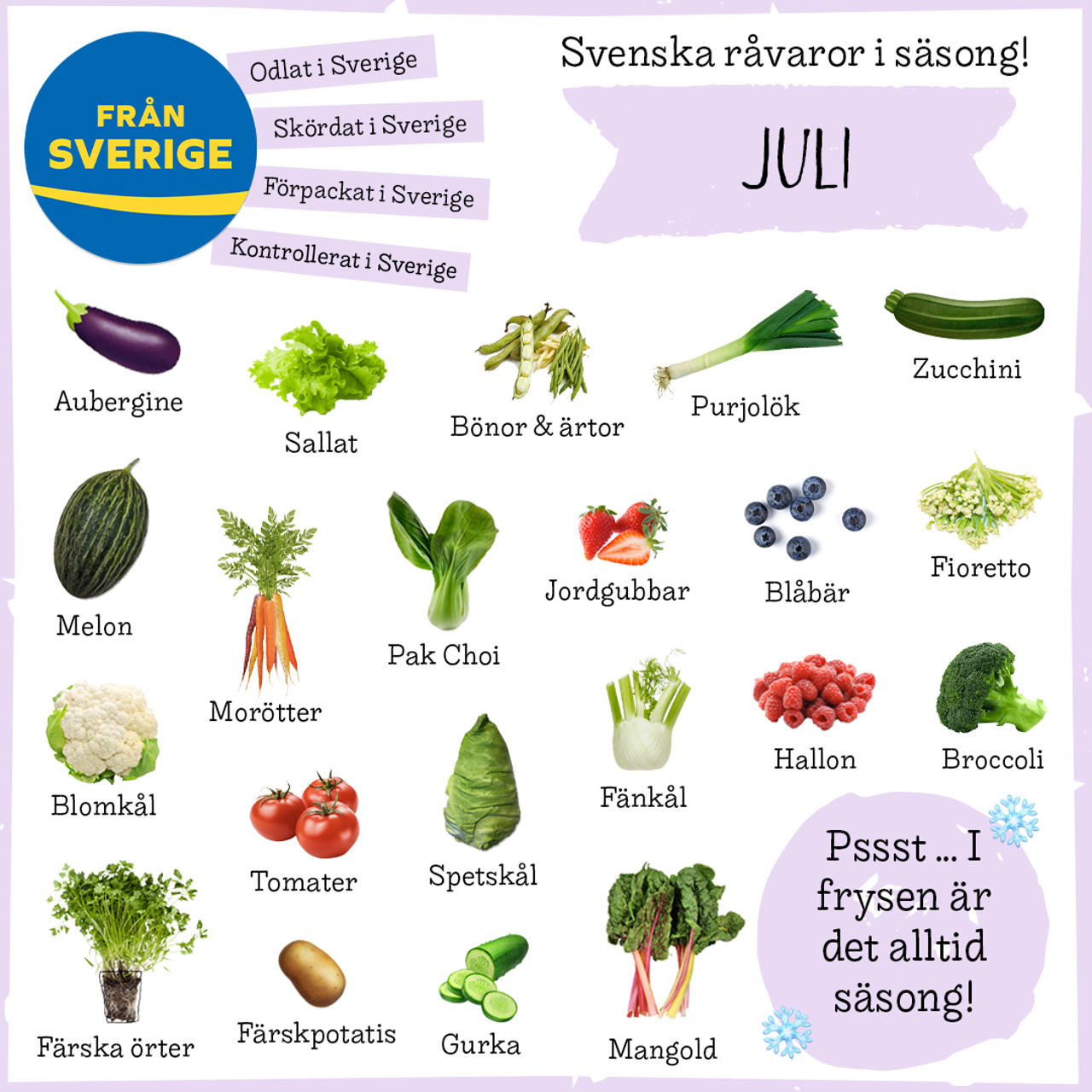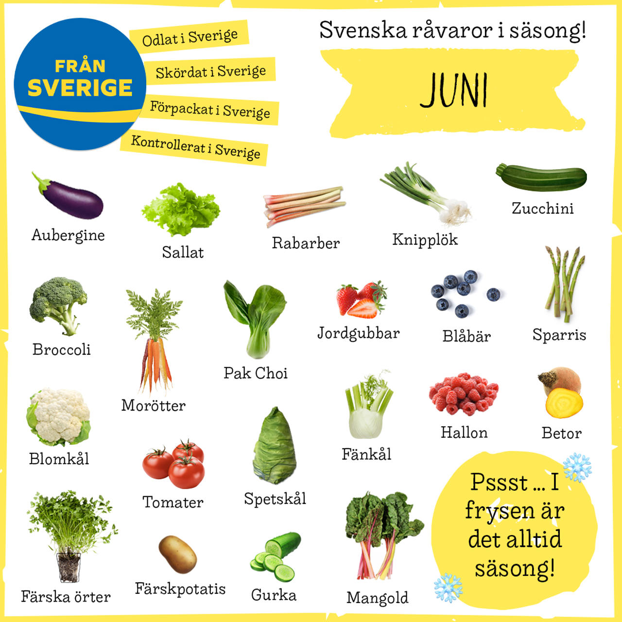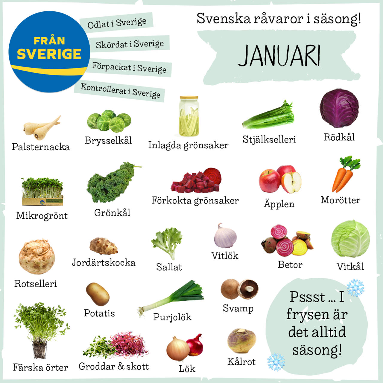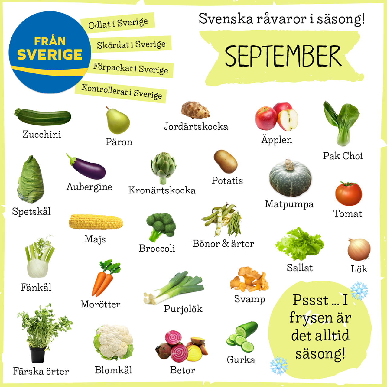 Här ser du vilka svenska grönsaker, frukter och bär som är i säsong. Det kan variera lite beroende på om du är verksam i norra eller södra Sverige. I frysen är det alltid säsong!