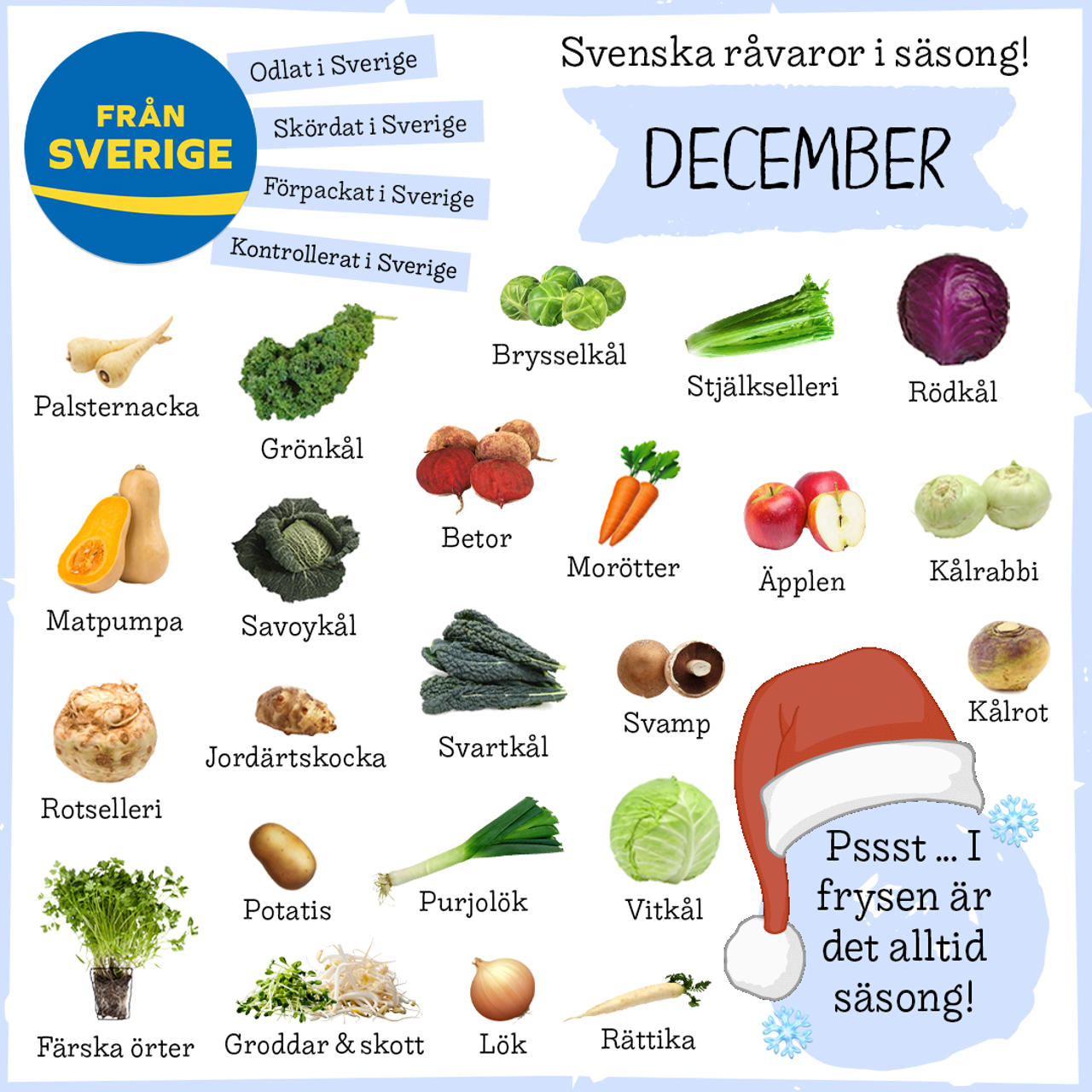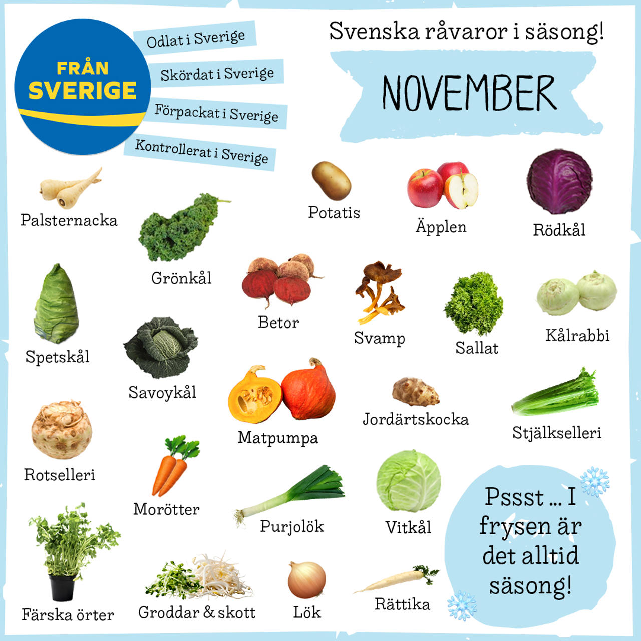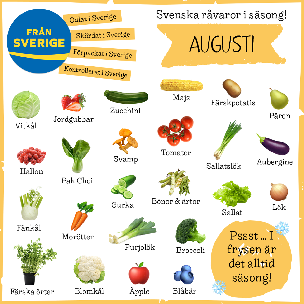 Här ser du vilka svenska grönsaker, frukter och bär som är i säsong. Det kan variera lite beroende på om du är verksam i norra eller södra Sverige. I frysen är det alltid säsong!