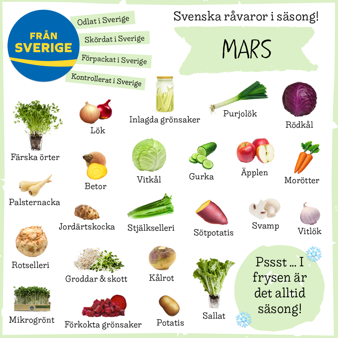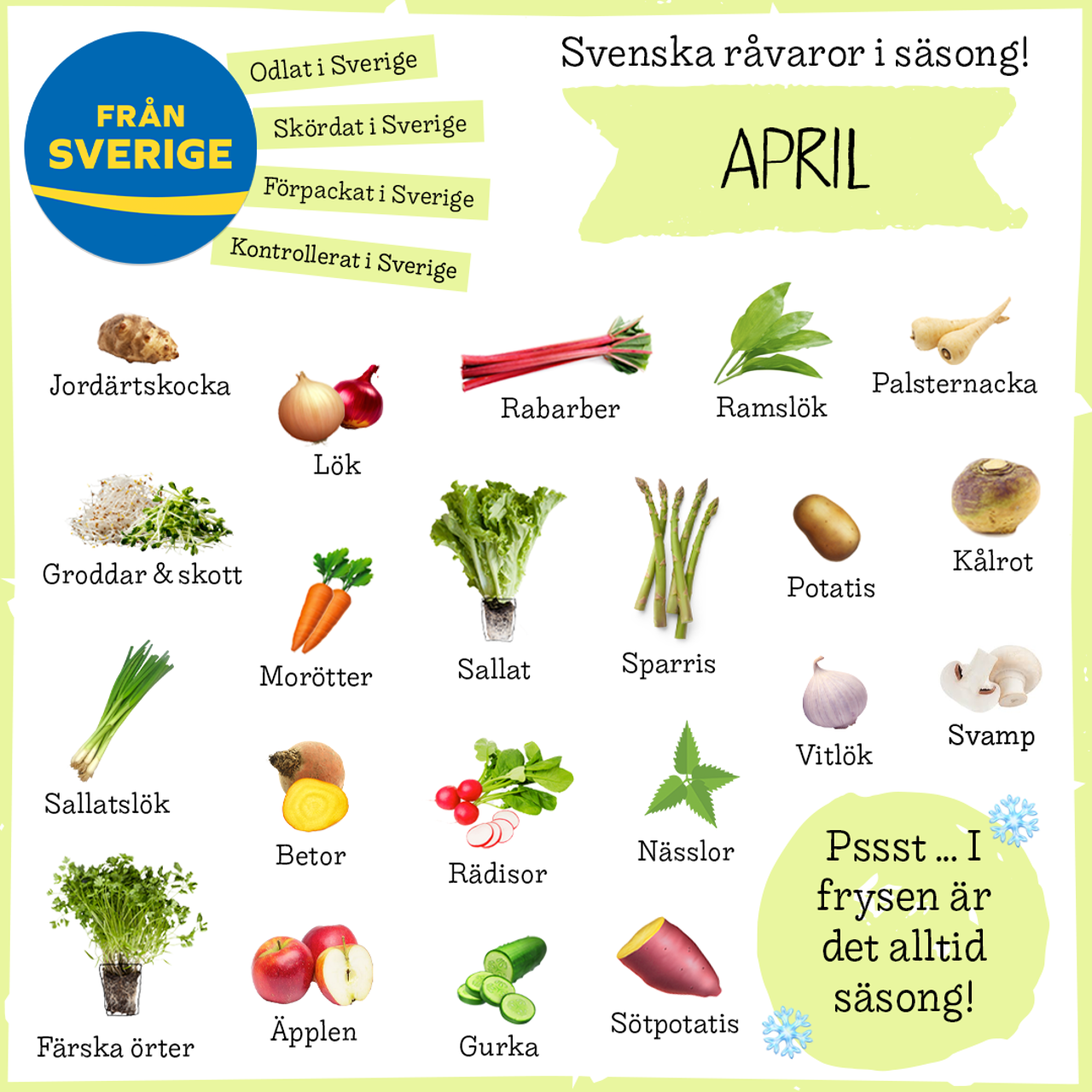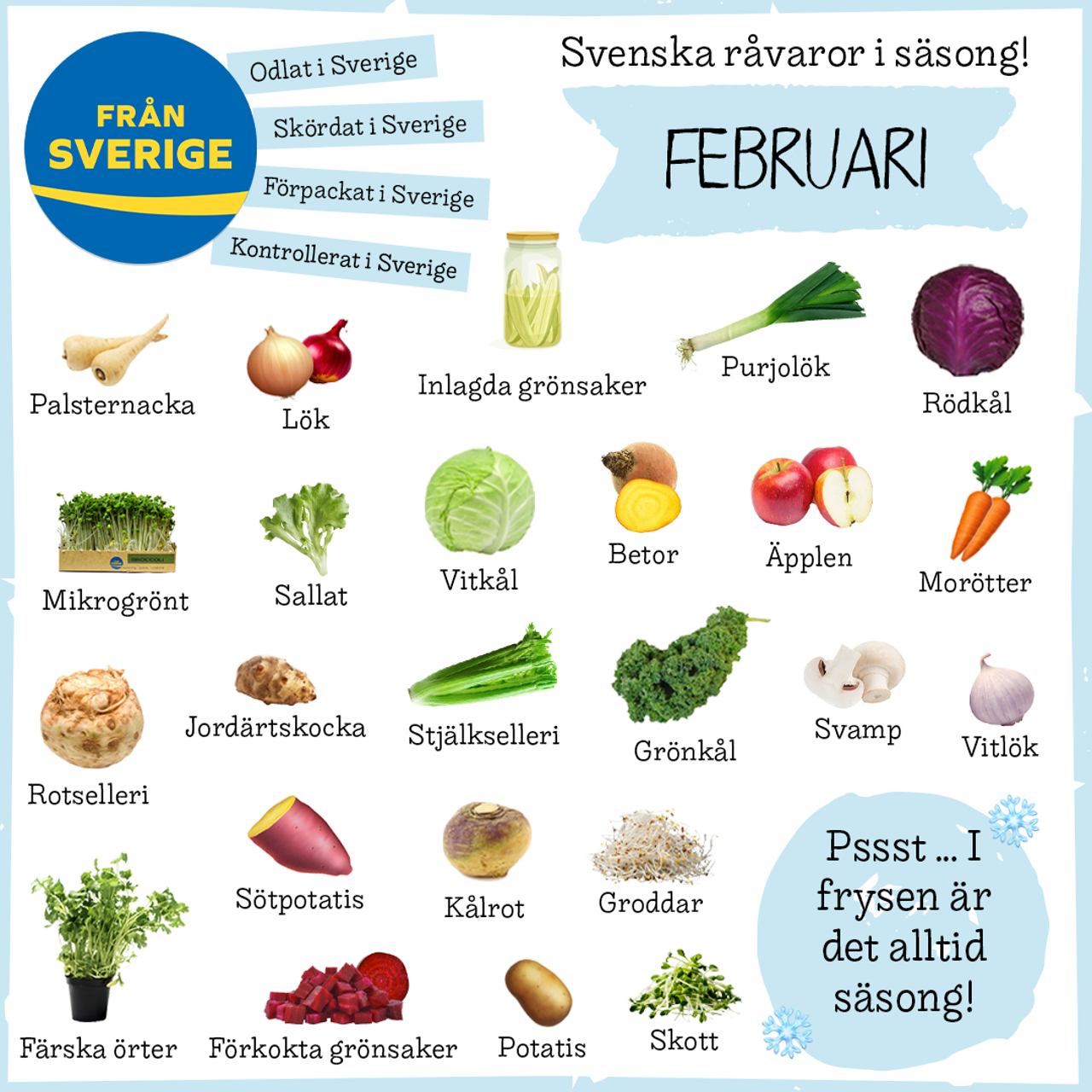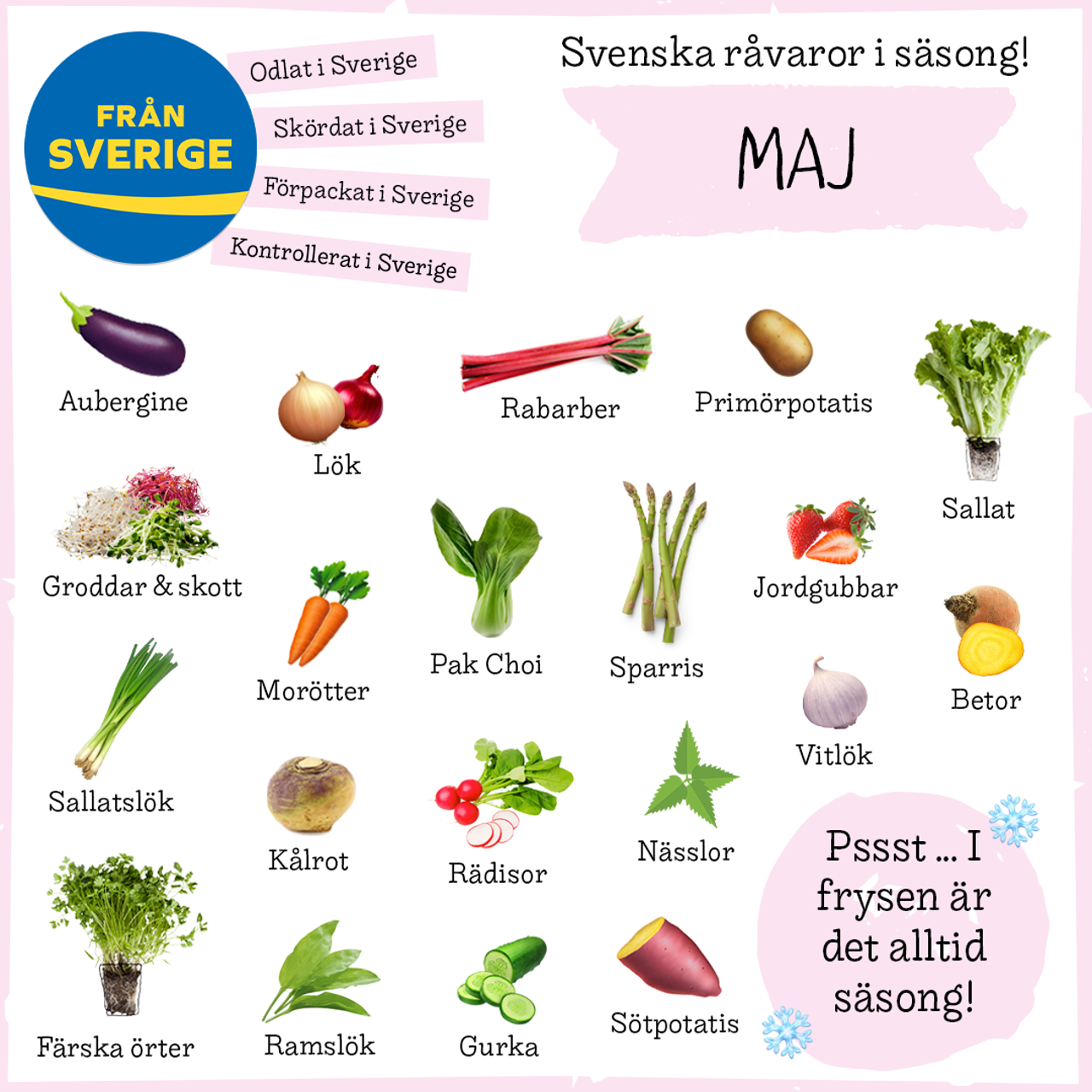 Här ser du vilka svenska grönsaker, frukter och bär som är i säsong. Det kan variera lite beroende på om du är verksam i norra eller södra Sverige. I frysen är det alltid säsong!