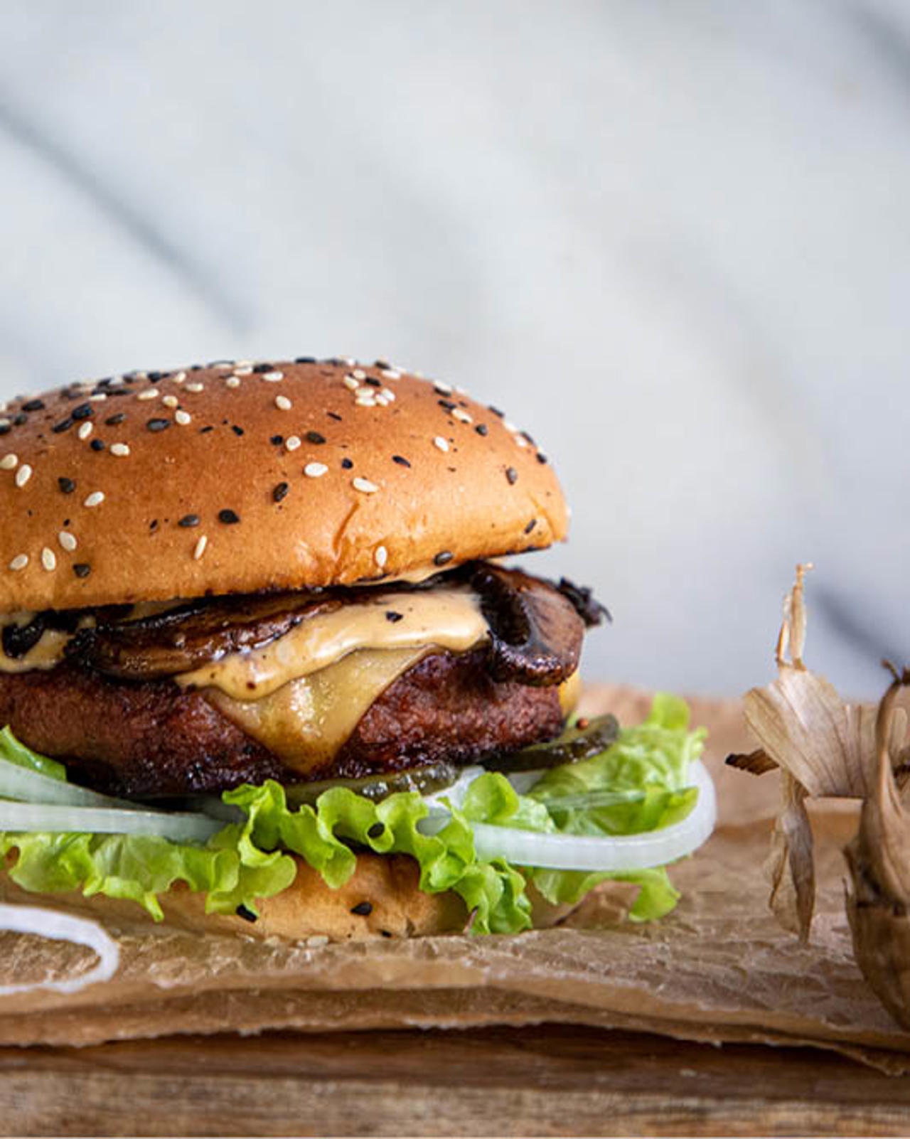 Bygg burgarna med 1 msk dijonsenap vardera i botten, därefter sallad, silverlök, skivad gurka, vegoburgare med ostalternativ, umamidressing och sist svampbacon.