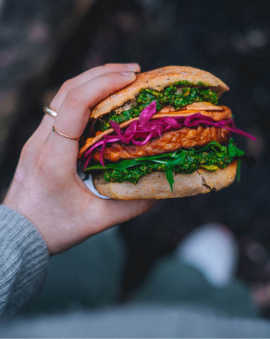 - Bred ut pesto på nederdelen, toppa med bladgrönt, burgare, rödkål, sötpotatis och mer bladgrönt.