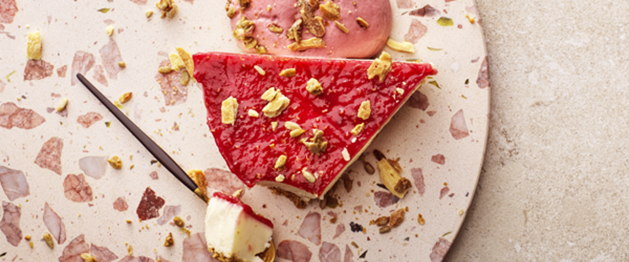 Halloncheesecake med hallonskum, rostad vit choklad