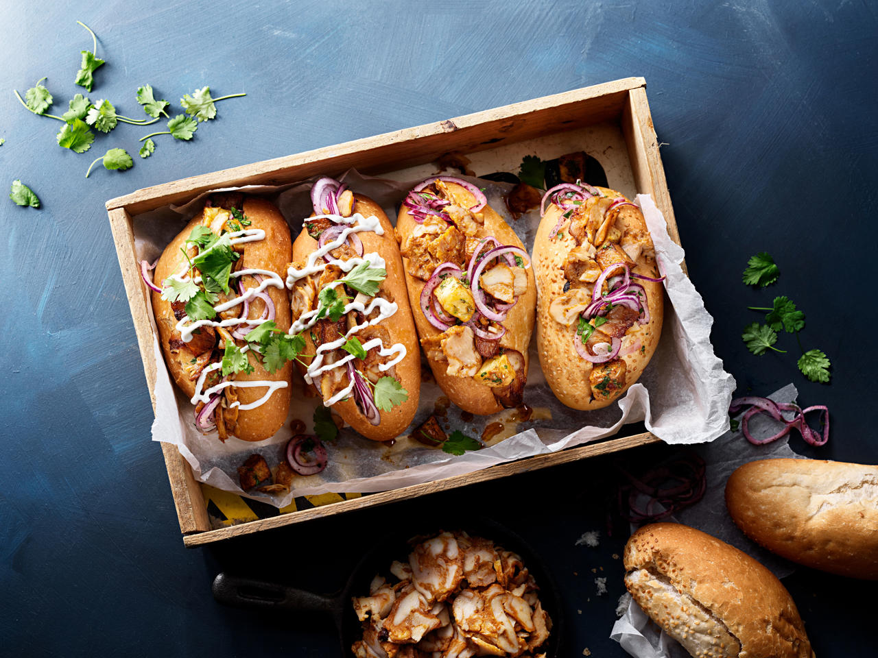 Bjud på en ny god, upplevelse för gästen – grilla baguetter och fyll med yoghurt, kycklingkebab, rödlökssallad samt chilipotatisen. Strö över koriander. Servera gärna med en hummus till.