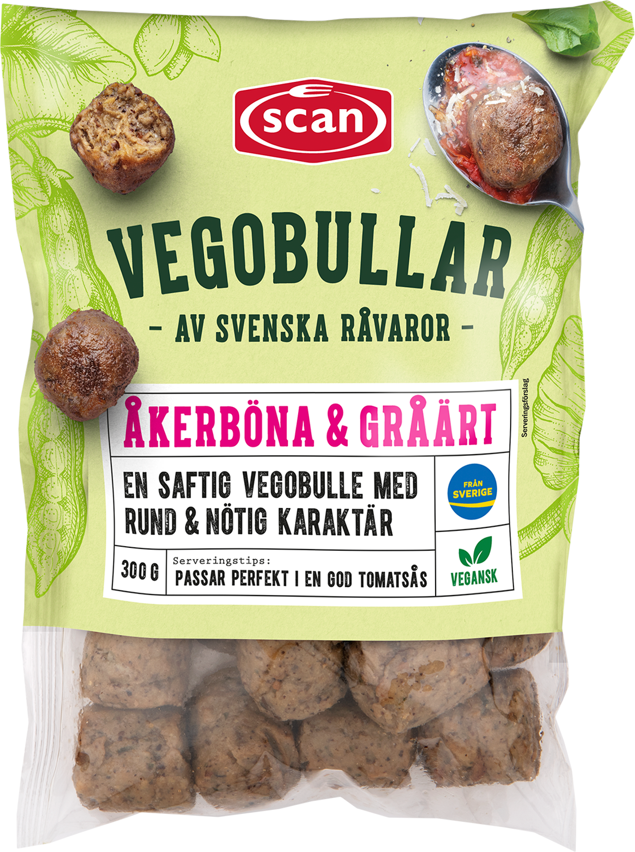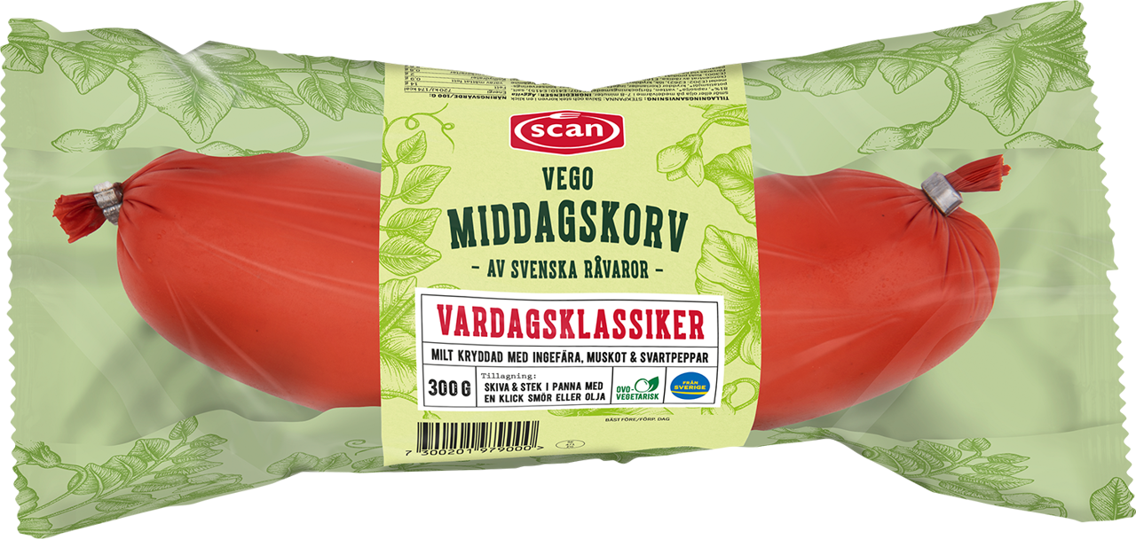 Scans Vegobullar är gjorda på en bas av svensk åkerböna och gråärt. Bullarna är veganska och varsamt kryddade med bl.a. salt, svartpeppar och persilja för att få en riktigt rund och god smak. Prova gärna att servera dem med en mustig tomatsås, nykokt pasta och mozzarella eller lite riven parmesan.VEGOKORV