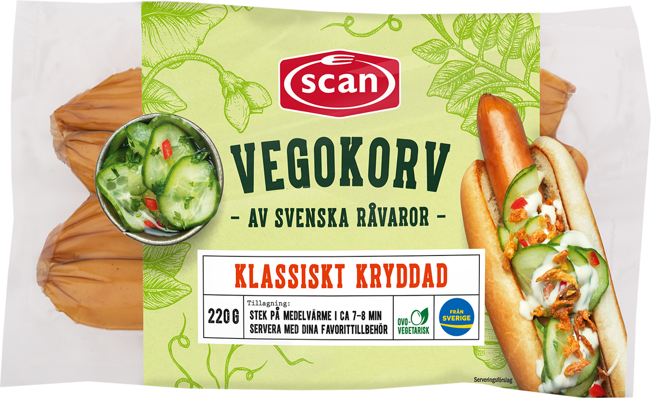 Scan Vegokorv är en ovo-vegetarisk korv gjord på en bas av svenska ägg och rapsolja. Korven är klassiskt kryddad med bl.a. ingefära, muskot och svartpeppar. Perfekt att steka några minuter i pannan och servera i korvbröd med dina favorittillbehör.