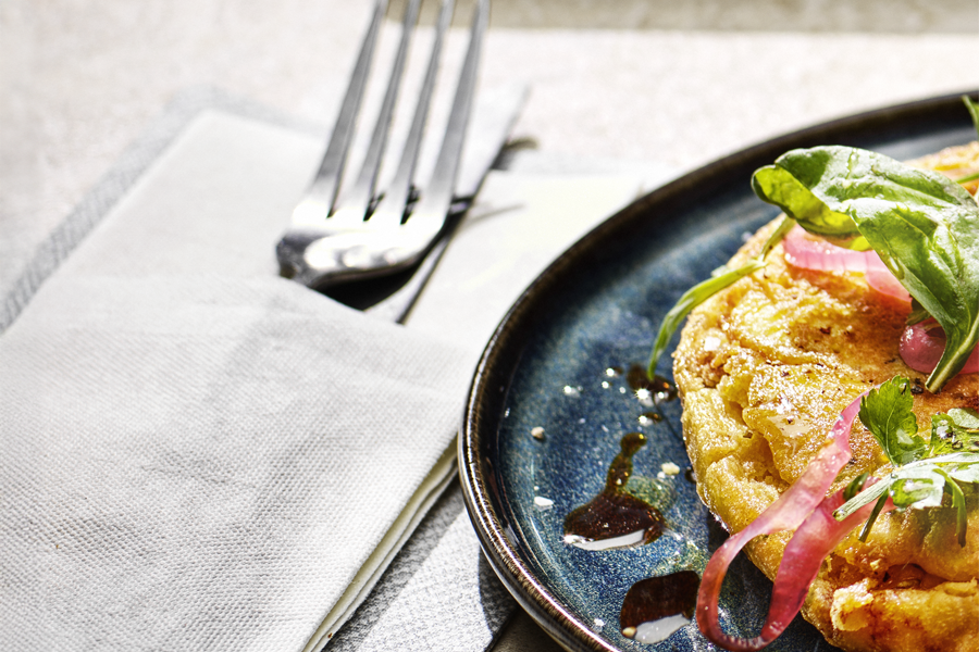 Gör såhär: Vispa ihop kikärtsmjöl, vatten, kolsyrat vatten, olivolja, örter, salt och peppar i en skål till en slät