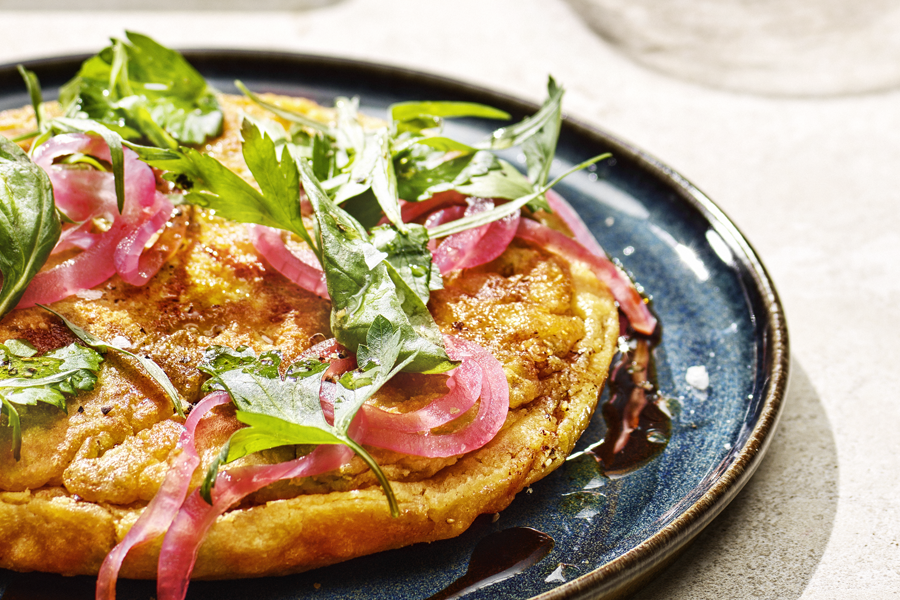 smet. Låt vila i 10–15 minuter. Hetta upp en stekpanna med olivolja på medelhög värme. Häll i smet och stek i tre till fyra minuter på ena sidan tills den fått en gyllene yta. Vänd och stek ytterligare två till tre minuter.