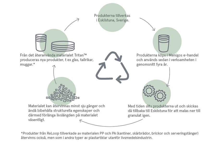 *Produkter från ReLoop tillverkade av materialen PP och PA (kantiner, skärbrädor, brickor och serveringstänger) återvinns också, men som i andra typer av plastartiklar utanför livsmedelsindustrin.