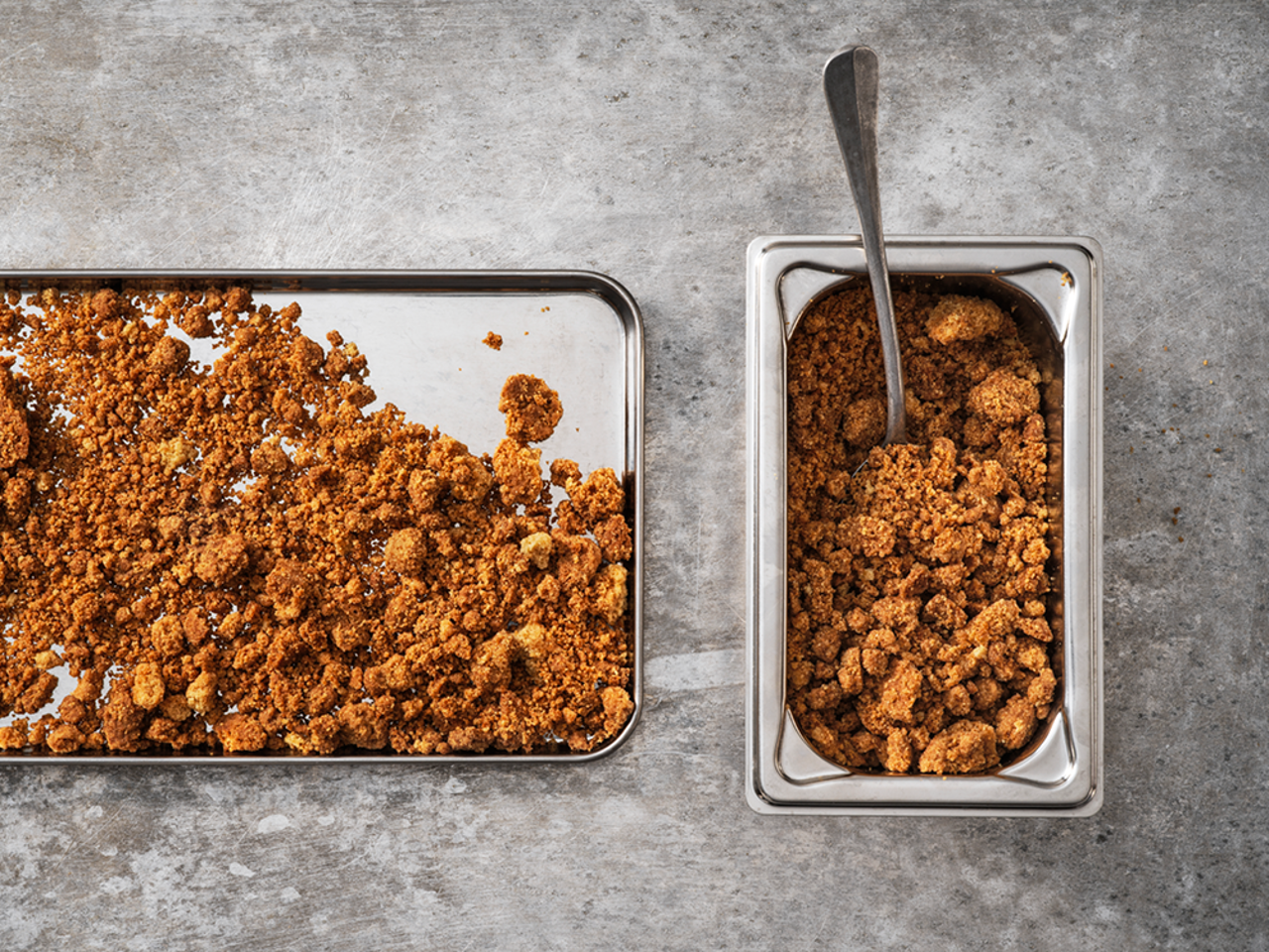 2. Strö ut smulorna på en plåt med bakplåtspapper. Grädda i ugn på 175° ca 10 min.