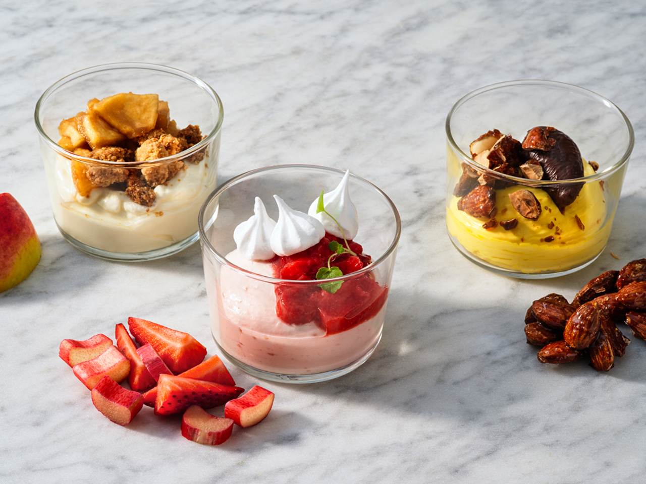 Med olika baser, toppings och crunch får du många komponenter att välja bland, vilket gör det enkelt att säsongsanpassa dina desserter. Se också vad som finns i säsong. En bas som vanligtvis smaksätts med hallon passar lika bra att göra på andra bär om det finns tillgängligt till bättre pris. Även de olika toppingarna kan varieras efter vad som är i säsong. På så vis kan du hålla nere råvarukostnaderna.