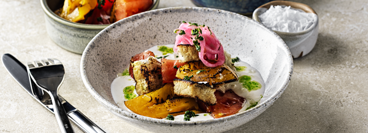 Lägg burratan i botten av en djup tallrik och krydda med lite extra flingsalt och svartpeppar, lägg på tomatskivan med den sotande sidan upp. Lägg tre ringar picklad lök ovanpå, häll sedan på två till tre matskedar vinägrett. Avsluta med det grillade brödet och några basilikablad.