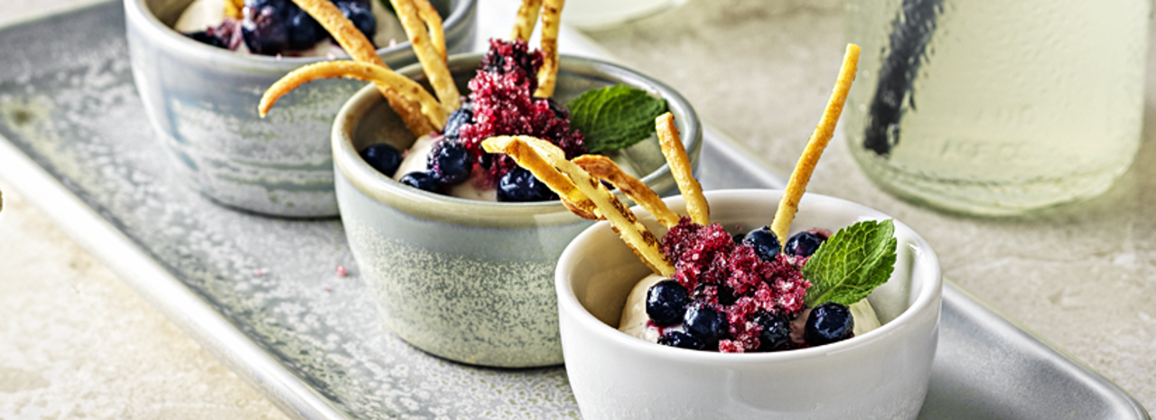 Gör såhär: Ta ut blåbären ur frysen och lägg på ett bleck, spraya lite vatten och pudra genast över sockret. Skaka lite på blecket och ställ sedan in det i frysen. Lägg vaniljkräm i botten på en skål. Toppa med blåbär och rostad pannkaka.
