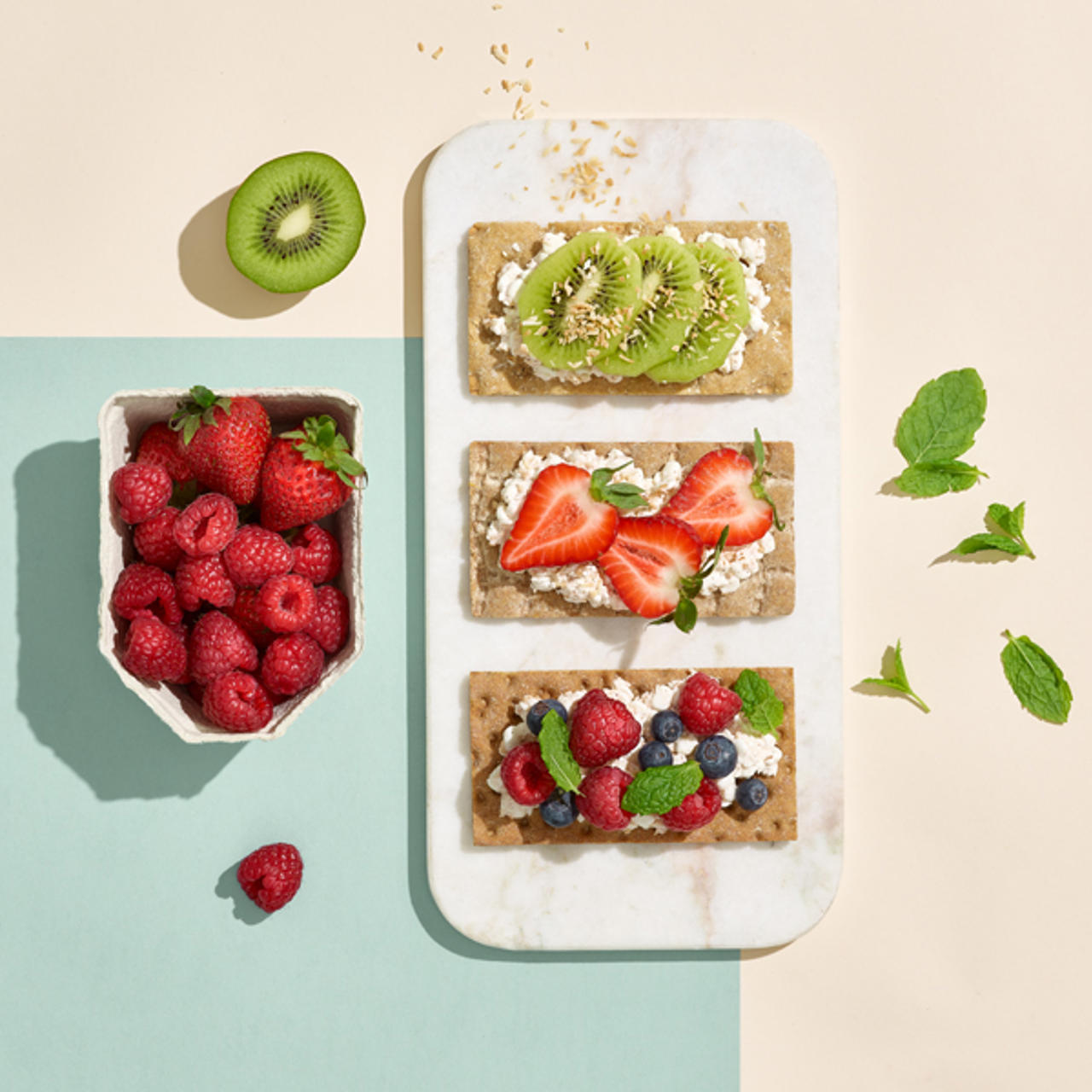 - Lägg kesoröran på knäckebrödet och dekorera med frukt och bär.