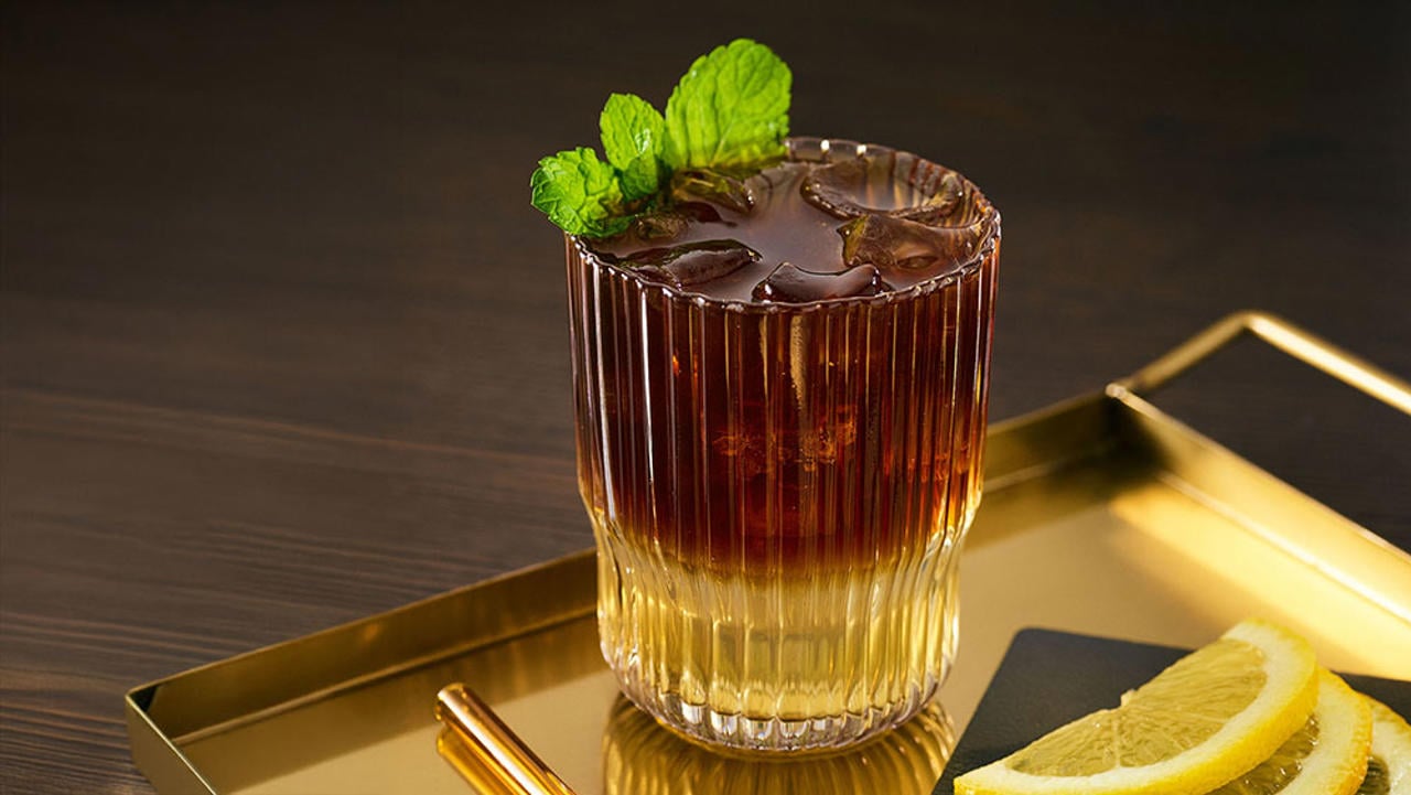 Fyll ett snyggt glas eller bägare med is. Lägg citronskivorna längs kanterna. Fyll upp glaset med lemonad och toppa med cold brew. Garnera med mynta.