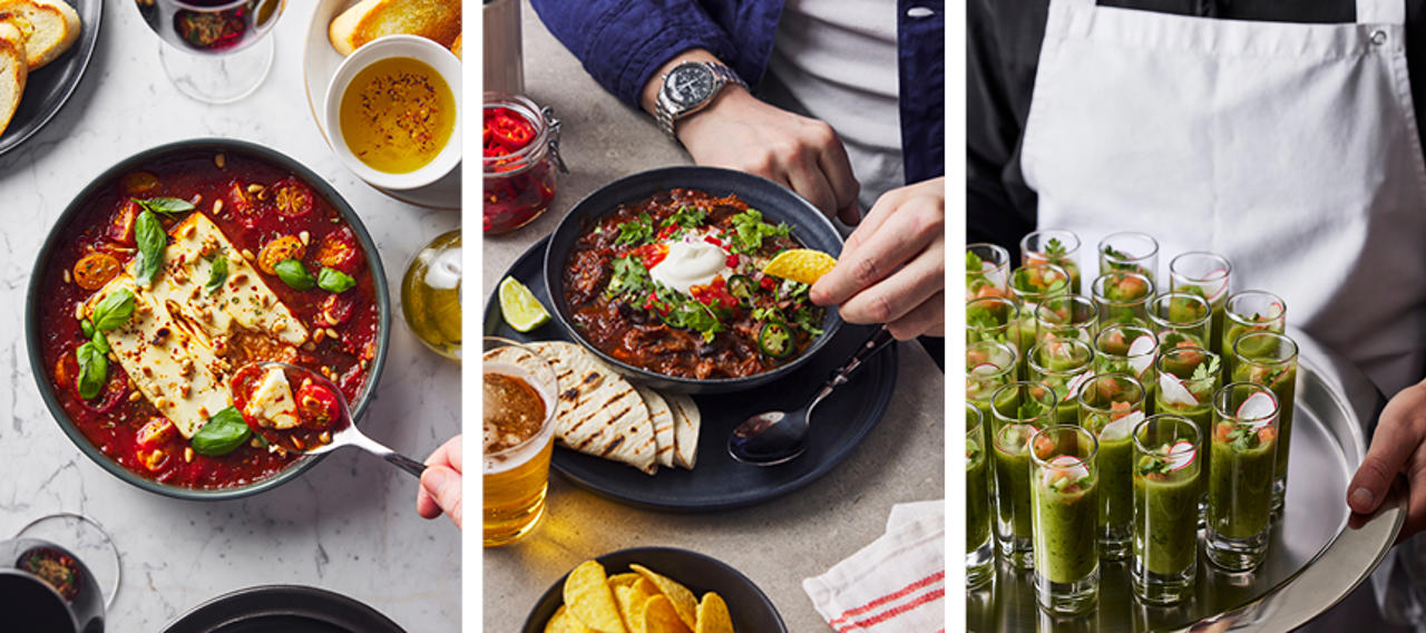 Salsabakad feta med Chunky Salsa, Superbowl-chili med Taco Sauce och Gazpacho-shots med Salsa Verde.