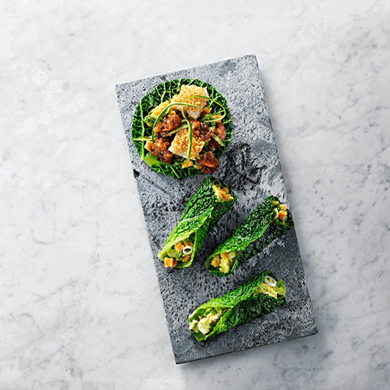 Taco på rostad kål med quinoa panerad torsk och ”ceviche” sallad