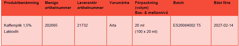 Leverantör Arla Foods återkallar 202665 Kaffemjölk 1,5% Laktosfri på grund av att leverantören har upptäckt en kvalitetsavvikelse i en del av tillverkningsprocessen för produkten.