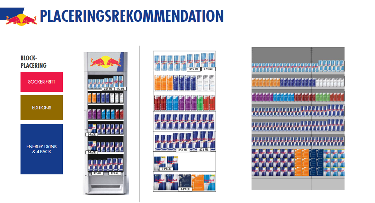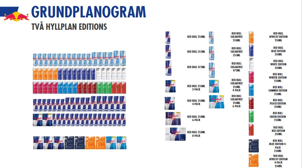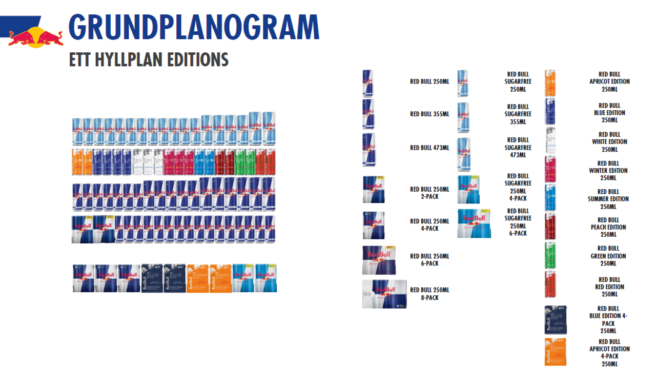 Har du en Red Bull-kyl i din butik bör du även ha rätt antal och rätt mix i kylen för maximal försäljning, se bilderna nedan för olika planogram utifrån storlek på din kyl.