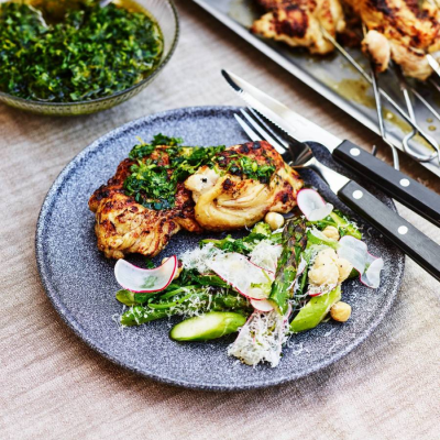 Yoghurtgrillat kycklingspett med ramslöksgremolata och sotad sparrissallad