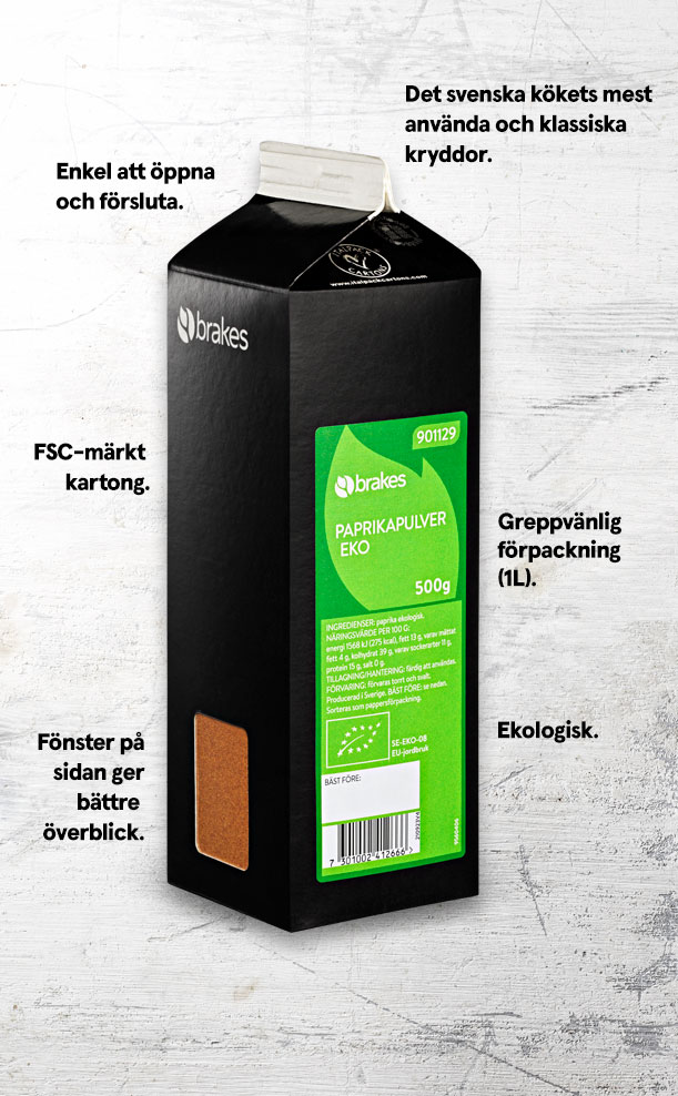Den nya förpackningen är mindre än de befintliga 2L-förpackningen, vilket gör den enklare att greppa med en hand. Den är smidig att öppna och försluta och har försetts med ett fönster på sidan som gör det enkelt att se vilken krydda som är i förpackningen. Förpackningen är dessutom producerad av kartong från ansvarsfulla källor (FSC-certifierade). FSC-märkta produkter är en garanti för att råmaterialet kommer från ett hållbart skogsbruk. Den tomma kartongen sorterar du som pappersförpackning.